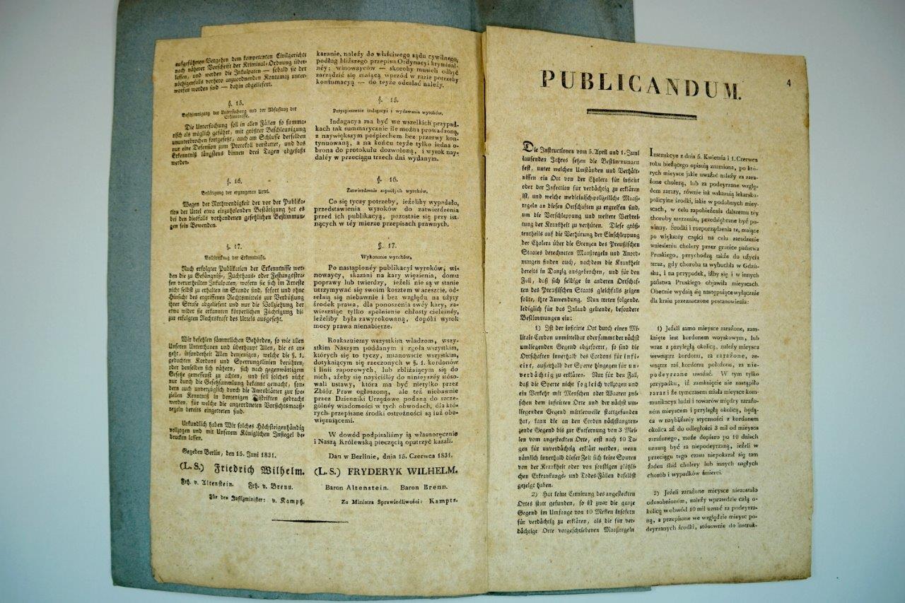 Angefügt war außerdem ein „Publicandum der Königlichen Immediat-Commission zu Berlin wegen Abwendung der Cholera“ – „unter der Auflage […], diese höchsten Verordnungen schleunigst, und spätestens auf künftigen Schabbas, den 20. d[iesen Monats] in der Synagoge den versammelten Mitgliedern verlesen zu lassen und sie über den Inhalt zu belehren“ – beide Dokumente gedruckt auf Deutsch und Polnisch.