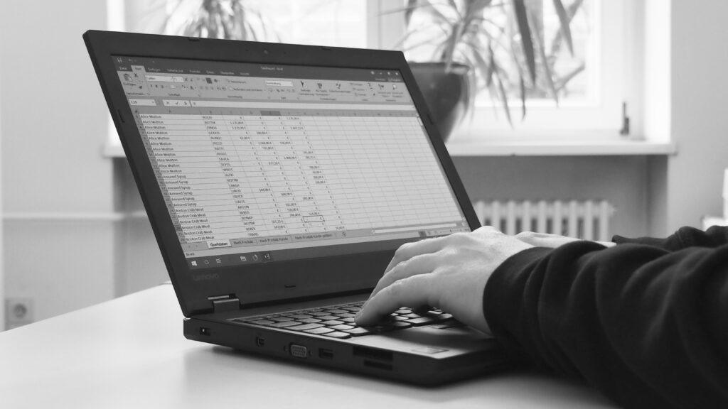 Schwarz-Weiß-Bild eines Laptops mit einem 3D-Modell auf dem Bildschirm, im Hintergrund ein kunstvoll gestaltetes Geländer.